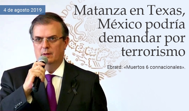 | 4 de agosto de 2019 - El secretario de Relaciones Exteriores de México, Marcelo Ebrard, informó que su país podría interponer una denuncia por terrorismo tras el tiroteo en El Paso, Texas, que provocó la muerte de veinte personas, entre las cuales siete ciudadanos mexicanos [la séptima víctima fue confirmada alrededor de las 8 pm el 4 de agosto, hora de la Ciudad de México, nota del redactor]