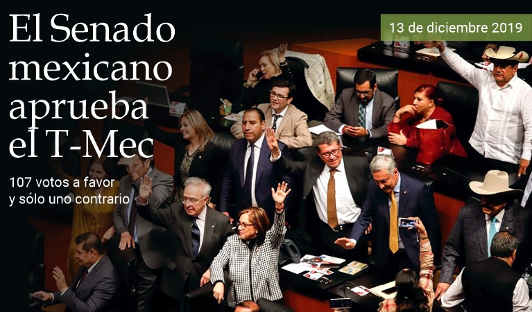 13 de diciembre de 2019 - Con 107 votos a favor y uno en contra, el pleno del Senado mexicano aprobó anoche el protocolo modificatorio del Tratado entre México, Estados Unidos y Canadá (T-MEC) —suscrito el pasado martes por representantes de los tres países— así como dos acuerdos paralelos. Durante el debate, la oposición destacó los riesgos de avalar el protocolo de manera apresurada y señaló los puntos rojos del acuerdo que podrían perjudicar los intereses de México. La senadora Alejandra Reynoso (PAN), subrayó los peligros inherentes al hecho de que la discusión se estuviese realizando pocas horas después de que se diera a conocer la versión en español de las modificaciones y la existencia de dos capítulos desconocidos hasta ese momento. Estos apartados se refieren al fortalecimiento de la cooperación de cumplimiento de las leyes ambientales y las verificaciones aduaneras relativas al comercio de flora y fauna silvestre obtenida ilegalmente. (massimo barzizza / puntodincontro.mx)