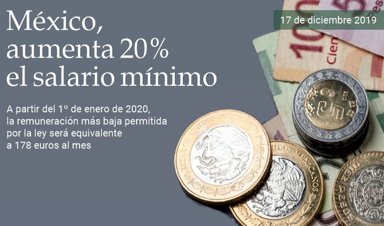 | 17 de diciembre de 2019 - La Comisión Nacional de Salarios Mínimos de México —cuyo Consejo de Representantes incluye miembros del gobierno, de los trabajadores sindicalizados y de los empresarios— anunció un aumento de 20% a las retribuciones mínimas a partir del 1 de enero a nivel nacional y de 5% en la frontera norte del país. La remuneración más baja permitida pasará de 102.68 pesos a 123.22 pesos al día, es decir, 3,746 pesos mensuales (aproximadamente 178 euros), mientras que en la zona libre de la frontera norte, donde el año pasado se duplicó el salario, pasará de 176.72 a 185.56 pesos diarios, es decir, 5,641 pesos mensuales (aproximadamente 267 euros). La secretaria federal del Trabajo Luisa María Alcalde destacó que se trata del mayor incremento en los últimos 44 años. «Estamos ante un punto de inflexión que pone fin a la caída de 73% del poder adquisitivo registrado por más de 4 décadas. Calculamos que este aumento beneficiará a 3.44 millones de trabajadores». «Mi reconocimiento a los empresarios de México» —dijo el presidente Andrés Manuel López Obrador— «por impulsar el crecimiento salarial, por actuar como lo están haciendo. Vamos a seguir con esta política. El salario mínimo siempre impulsa los salarios contractuales». (massimo barzizza / puntodincontro.mx)
