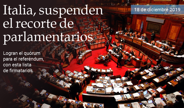 18 de diciembre de 2019 - Se alcanzó el quórum de senadores (una quinta parte del total) necesario para dar inicio a la organización del referéndum sobre el recorte de parlamentarios. Las suscripciones, que se encuentran custodiadas en una oficina del Palazzo Madama, deberán ser enviadas en las próximas horas a la Corte Constitucional, por lo que, salvo sorpresas, el proceso para la entrada en vigor de la ley se encuentra suspendido. La siguiente es la lista de los 64 firmatarios: