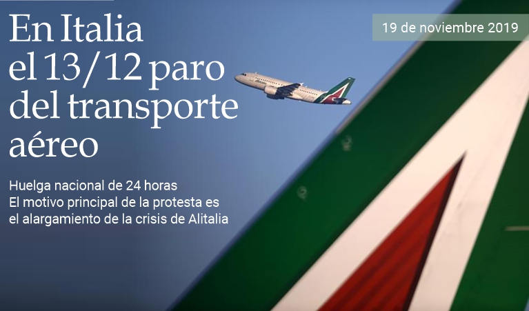 | 19 de noviembre de 2019 - No habrá vuelos en Italia el 13 de diciembre. Los sindicatos de trabajadores del sector del transporte (Filt-Cgil, Fit Cisl y Uiltrasporti) emplazaron hoy una huelga de 24 horas. Entre los motivos: la permanencia de la crisis de Alitalia, la exigencia de normas para el sector a partir de la aplicación del contrato nacional en todas las empresas y el refinanciamiento del Fondo Extraordinario que se utiliza para apoyar los ingresos de los trabajadores involuntariamente desempleados. En particular, Alitalia, recuerdan los sindicatos, «actualmente está aplicando la Cassa Integrazione Guadagni Straordinaria —una ayuda financiera del Estado prevista por la legislación italiana para pagar los sueldos de los empleados de empresas en dificultad— a más de 1,000 trabajadores equivalentes a tiempo completo del personal de tierra y de vuelo, además de presentar una serie de problemas contractuales no resueltos que han estado pesando demasiado sobre los trabajadores y agravando una situación ya muy crítica en términos de incertidumbre con respecto al futuro de la compañía y el nuevo plan de negocios de Alitalia, sobre el cual los firmantes del emplazamiento han estado pidiendo, sin éxito, un debate desde hace meses». (massimo barzizza / puntodincontro.mx)