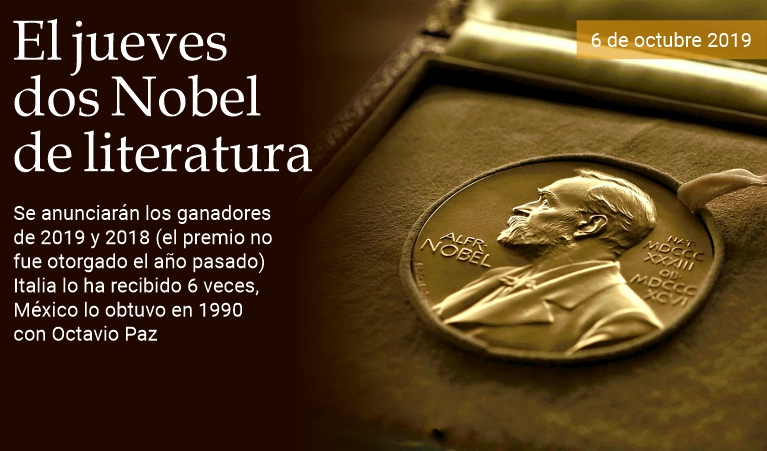6 de octubre de 2019 - 2019 será recordado como el año de los dos premios Nobel de literatura: el jueves 10 de octubre, a las 6 am del centro de México (la 1 de la tarde en Italia), se anunciará el nombre del ganador de 2019 y, al mismo tiempo, también el de 2018, suspendido el año pasado después de un escándalo por presunto acoso y los rumores de una investigación sobre filtraciones (la transmisión en vivo podrá ser vista en el sitio web nobelprize.org). El último premio otorgado en 2017 fue para el japonés naturalizado británico Japón Kazuo Ishiguro (1954), autor, entre otras, de las novelas Los restos del día y Nunca me abandones (ambas publicadas en México por Anagrama y en Italia por Einaudi). En 2016 ganó el cantautor estadounidense Bob Dylan. Italia ha recibido el Nobel de Literatura en seis ocasiones, con Giosuè Carducci (1906), Grazia Deledda (1926), Luigi Pirandello (1934), Salvatore Quasimodo (1959), Eugenio Montale (1975) y Dario Fo (1997). México lo obtuvo cuando en 1990 el reconocimiento fue otorgado al poeta y ensayista Octavio Paz —autor de El laberinto de la soledad— por su trayectoria y «escritura apasionada, de amplios horizontes, caracterizada por la inteligencia sensorial y la integridad humanística». (massimo barzizza / puntodincontro.mx)