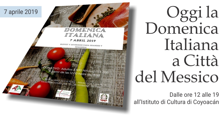 7 aprile 2019 - Un appuntamento immancabile quello di oggi, 7 aprile, con la Domenica Italiana per i cittadini dello Stivale e gli amici dell'Italia di Città del Messico. Giunto alla nona edizione, questo evento —organizzato dall'Associazione Italiana di Assistenza (AIA) a beneficio di molti connazionali del Bel Paese e dei loro coniugi e discendenti in situazione di difficoltà— è ormai uno dei punti di riferimento delle attività annuali della collettività italiana in Messico. Partecipano alla preparazione del buffet molte volontarie, che mettono a disposizione dei presenti diversi piatti, dall'antipasto al dolce. Gli sponsor offrono, inoltre, vino, bibite e caffè. Come gli anni scorsi, giovani e adulti potranno divertirsi con altre attività: dopo pranzo e fino al termine dell'evento ci saranno tornei di biliardino, domino e ping pong, oltre alla tombola e la riffa. I premi saranno offerti dalle molte società che sostengono questo sforzo di volontari, imprese ed istituzioni per passare insieme una giornata semplice e divertente aiutando chi ne ha bisogno. La Domenica Italiana si svolge all''Istituto Italiano di Cultura —Francisco Sosa 77, Coyoacán— dalle 12:00 alle 19:00. Il biglietto ha un costo di 500 pesos per gli adulti e 200 pesos per i bambini da 2 a 11 anni.