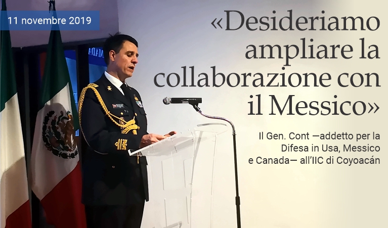 11 novembre 2019 - Alla presenza dell'ambasciatore d'Italia designato in Messico, Luigi De Chiara, del presidente del Com.It.Es., Gianluca Brocca, del direttore dell'Istituto Italiano di Cultura (IIC), Marco Marica, e di un folto gruppo di invitati, il generale dell'Aeronautica Stefano Cont —addetto militare per la Difesa e la Cooperazione per la difesa negli Stati Uniti, in Messico e in Canada— ha pronunciato un discorso giovedì scorso all'IIC della capitale messicana, in occasione della celebrazione della Giornata dell'Unità Nazionale Italiana e delle Forze Armate.
