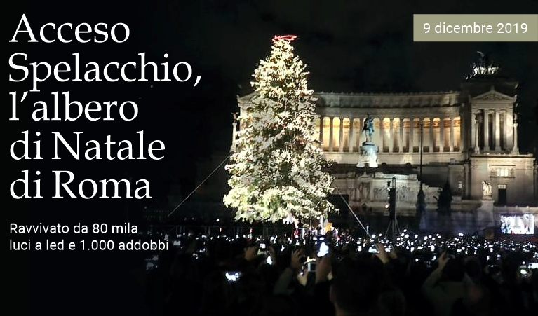 | 9 dicembre 2019 - Ravvivato da 80 mila luci a led e 1.000 addobbi, tra sfere e cristalli di neve, si é acceso questa sera l'albero di Natale di Roma, soprannominato in maniera ironica dal 2017 “Spelacchio”. Lo ha inaugurato la sindaca Virginia Raggi dando il via anche all'illuminazione dell'attigua via del Corso, nota strada dello shopping della Capitale italiana. Gli allievi della scuola di canto corale del Teatro dell'Opera hanno accompagnato il 'ritorno' dell'abete più famoso della città eterna, che quest'anno è stato decorato con sfere natalizie prevalentemente rosse e dorate. «Finalmente» —ha detto la Raggi fra gli applausi della folla— «siamo qui ad accendere Spelacchio, l'albero più famoso del mondo. Sarà acceso 24 ore al giorno fino al 6 gennaio». (massimo barzizza / puntodincontro.mx)