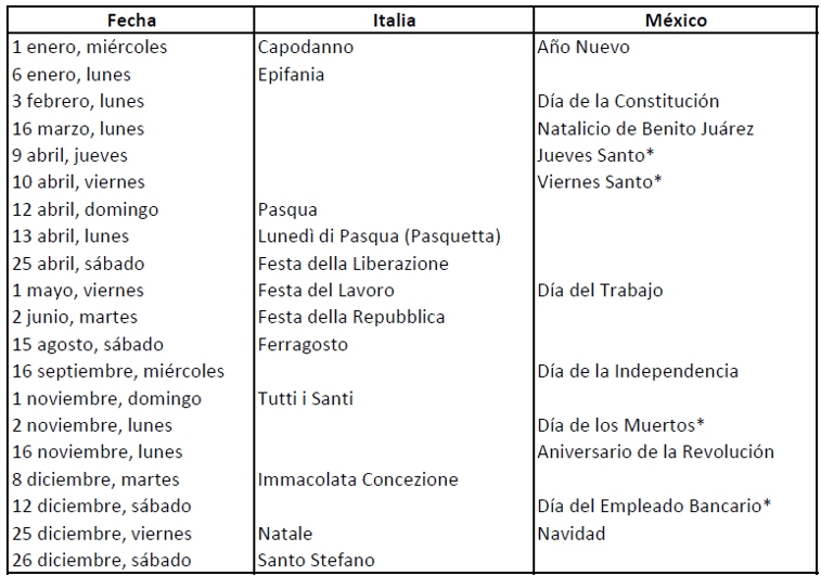 | 1 de enero de 2020 - Publicamos a continuación la lista de días festivos del 2020 en Italia y México. Para Italia, sólo se consideraron los feriados legalmente reconocidos a nivel nacional, mientras que para México la tabla incluye las fechas oficiales y aquellas en las que las instituciones financieras permanecerán cerradas, estas últimas señaladas con un asterisco.