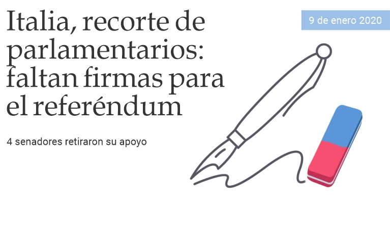 9 de enero de 2019 - Sorpresa en el caso del recorte de parlamentarios italianos. La presentación de las firmas en la Corte Suprema de Casación estaba programada a las 11 de la mañana de hoy, pero se pospuso porque algunos signatarios retiraron su apoyo. Las firmas requeridas para el referéndum constitucional son 64 (un tercio de una de las dos ramas del Parlamento), pero algunos senadores cambiaron de opinión en las últimas horas. Andrea Cangini, de Forza Italia —uno de los tres parlamentarios que respaldaron desde el principio esta iniciativa— asegura que se programará una nueva cita antes del 12 de enero, que es la fecha límite. «Fueron retiradas 4 firmas, pero otros se están sumando, por lo que, para ser justos, solicitamos un aplazamiento a la Corte de Casación», explicó. (repubblica.it / puntodincontro.mx / adaptación y traducción al español de massimo barzizza)