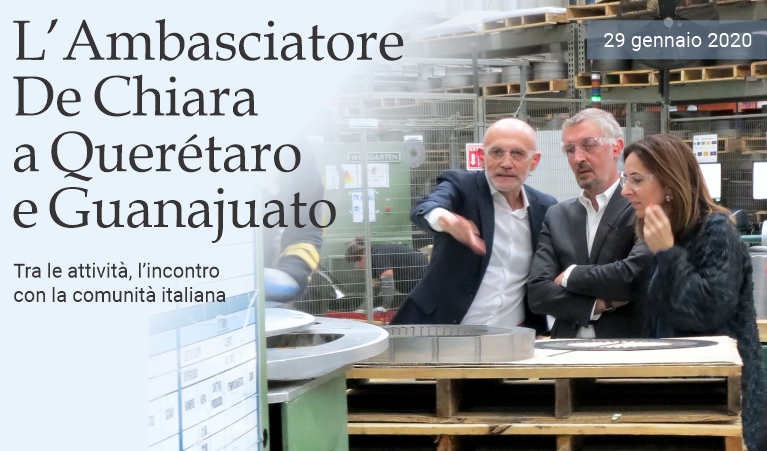 29 gennaio 2020 - Sabato 25 gennaio l'ambasciatore d'Italia in Messico, Luigi De Chiara, si è recato nella città di Querétaro, dove ha visitato lo stabilimento di Eurotranciatura —azienda attiva nel segmento dei lamierini magnetici tranciati per motori elettrici— ed ha incontrato la comunità italiana del Bajío, una regione geografica, storica, economica e culturale del Centronorte-Occidente del Messico, sede degli impianti produttivi di diverse società del Bel Paese. Leonardo Franchini, responsabile dell'Agenzia consolare onoraria d'Italia a Querétaro e direttore generale di Eurotranciatura, ed Eduardo Arana, vicedirettore generale dell'azienda, hanno accompagnato l'ambasciatore De Chiara, sua moglie Idoia Uribarri e Flavio Sereni, capo dell'ufficio economico-commerciale dell'Ambasciata, ad una visita allo stabilimento prima di riunirsi con circa 70 membri della comunità italiana per un brindisi. La città di Querétaro ospita, dallo scorso anno, anche il Capitolo Bajío della Camera di commercio italiana in Messico, co-sponsor di questo incontro. Il capo della diplomazia italiana in Messico ha continuato le attività all'inizio di questa settimana ed ha incontrato il governatore dello Stato di Querétaro, Francisco Domínguez Servién, e il presidente municipale di Colón, Alejandro Ochoa Valencia, con cui ha confermato il patto di amicizia firmato nel 1994 tra questo comune e la città di Genova. Nello Stato di Guanajuato, ha visitato lo stabilimento Pirelli di Silao —che, utilizzando tecnologie d'avanguardia, impiega circa 3.000 lavoratori— ed è stato ricevuto dal governatore Diego Sinhue Rodríguez Vallejo. (massimo barzizza / puntodincontro.mx)