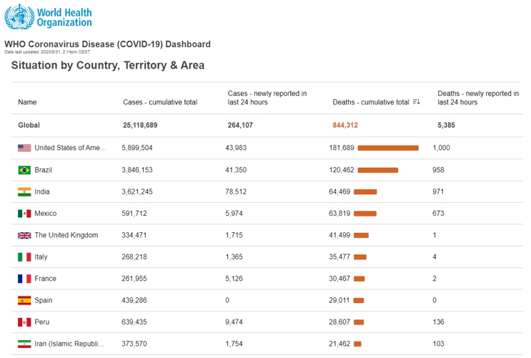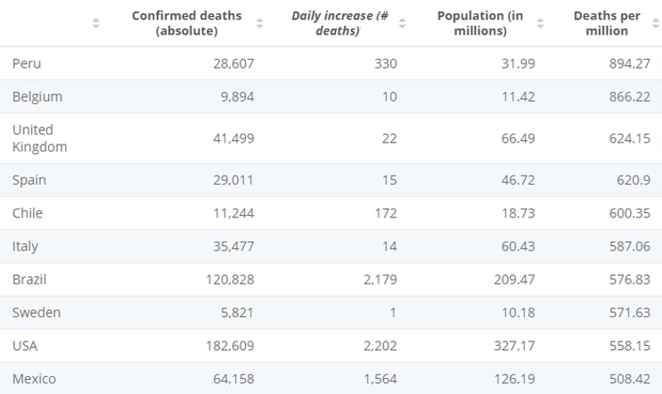 Ma il Messico continua a scalare posizioni nella tabella delle morti per milione di abitanti ed ha già raggiunto il 10º posto a livello mondiale. Di seguito riportiamo i dati pubblicati il 31 agosto 2020 dal sito Statista.com