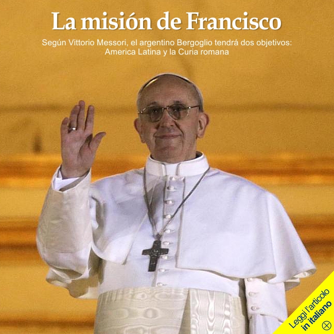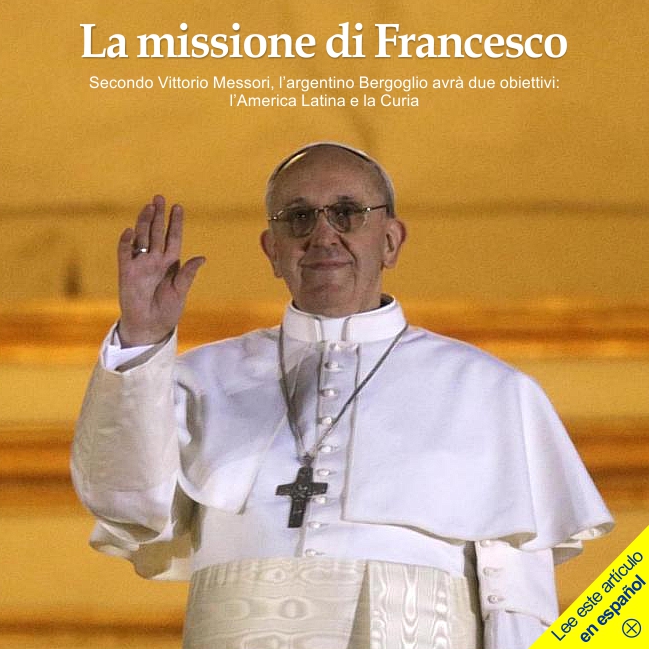 14 marzo 2013 - Secondo Vittorio Messori —giornalista e scrittore italiano, nato a Sassuolo in provincia di Modena e considerato lo scrittore di temi cattolici più tradotto al mondo— Papa Francesco avrà due missioni, l'America Latina e la Curia. Ecco il suo ragionamento: «In questo conclave c'era spazio per un'altra scelta geopolitica —come quella che diede origine all'elezione di Papa Wojtyla—, ma stavolta davvero urgente, anzi urgentissima, anche se in Europa non si conosce la serietà dell'evento. Succede, cioè, che la Chiesa romana sta per perdere quello che considerava il «Continente della speranza», il Continente cattolico per eccellenza nell'immaginario comune, quello grazie al quale lo spagnolo è la lingua più parlata nella Chiesa. L'America Latina, infatti, abbandona il cattolicesimo al ritmo di migliaia di uomini e donne ogni giorno. Ci sono cifre che tormentano gli episcopati di quelle terre: dall'inizio degli anni Ottanta ad oggi, in questa zona del mondo la Chiesa Cattolica ha perso quasi un quarto di fedeli. Dove vanno? Entrano nelle comunità, sette, chiesuole degli evangelicals, i pentecostali che, inviati e sostenuti da grandi finanziatori nordamericani, stanno realizzando il vecchio sogno del protestantesimo degli Usa: finirla, anche in quel Continente, con la superstizione «papista». Occorre dire che i grandi mezzi economici di cui quei missionari dispongono attirano i molti diseredati di quelle terre e li inducono a entrare in comunità dove tutti sono sorretti anche economicamente. Ma c'è pure il fatto che le teologie politiche dei decenni scorsi, predicate da preti e frati divenuti attivisti ideologici, hanno allontanato dal cattolicesimo quelle folle, desiderose di una religiosità viva, colorata, cantata, danzata. Ed è proprio in questa chiave che il pentecostalismo interpreta il cristianesimo e attira fiumane di transfughi dal cattolicesimo. Dunque, i padri del Conclave probabilmente avrebbero valutato l'urgenza di un intervento, secondo un programma proposto e gestito da Roma stessa, insediandovi come Papa uno di quel Continente». «Ma l'emorragia riguarda soprattutto il Brasile e l'America delle Ande: e allora perché —se Papa sudamericano doveva essere— scegliere un argentino, un arcivescovo di uno dei Paesi meno toccati dalla fuga verso le sette? Probabilmente ha giocato il fatto che il cardinal Bergoglio (a parte l'alta qualità dell'uomo, la preparazione teologica e l'esperienza) è al contempo iberoamericano ed europeo. La sua è una famiglia di immigrati recenti dall'astigiano, l'italiano è la sua seconda lingua materna. Per la Chiesa non sono urgenti solo i problemi di oltreatlantico, ma anche quelli di un riordino energico della Curia e occorreva un uomo che sapesse fronteggiare anche certe situazioni vaticane».