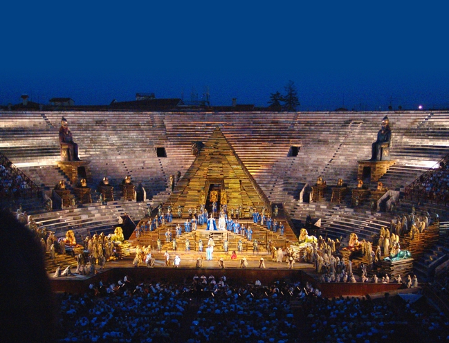 Eugenio Montale ha descritto Aida come l’opera che meglio si presta ad un teatro all’aperto, per i suoi effetti da Cinemascope e la sua grandiosità anche quando i sacerdoti portavano barbe di cartapesta e indossavano accappatoi da spiaggia… E poiché gli occhi son più volubili degli orecchi… è ovvio che l’Aida meno di ogni altra opera di repertorio potrà sfuggire alle intenzioni novatrici di scenografi, registi e coreografi. Solenne e rigido, il dramma faraonico verdiano trova nella scenografia storica di Ettore Fagiuoli del 1913 (che è stato rievocato nella serata del 3 settembre) l'ideale collocazione: una traduzione imponente, perfettamente adatta agli spazi areniani, che rivela il suo culmine nella Marcia trionfale del secondo atto, vera colonna sonora delle innumerevoli e prestigiose stagioni liriche veronesi.
