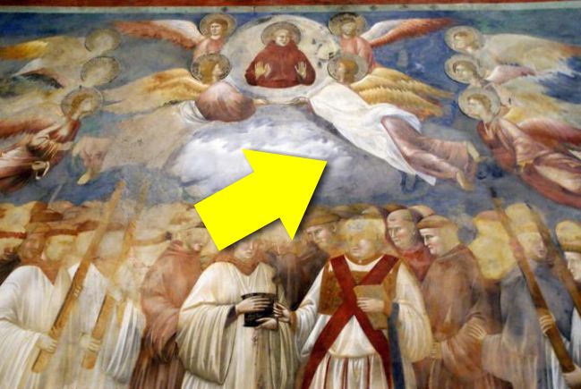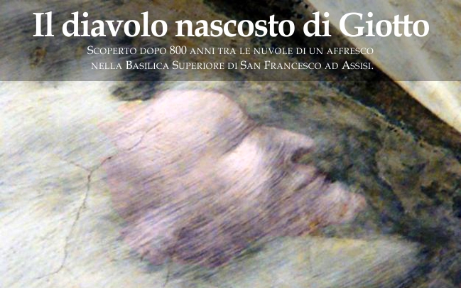 (paola pica / corriere.it / puntodincontro) 6 de noviembre de 2011. - Se descubrió el rostro de un demonio entre las nubes de un fresco de Giotto en la Iglesia Superior de San Francisco en Asís. Ha estado allí, con sus cuernos, durante 800 años, desde los albores del ciclo de pintura que marca el inicio del arte figurativo occidental. Ha sido observado por millones y millones de personas y nadie se había dado cuenta. Para encontrar la inquietante presencia en las nubes suspendidas entre la escena de la muerte de Francisco, abajo, y la escena de la asunción de su alma al cielo fue necesaria la capacidad de observación de la historiadora y especialista de San Francisco Chiara Frugoni. La noticia —publicada en la página del Sacro Convento — está dando la vuelta al mundo: "Más allá de la curiosidad y del valor teológico o pseudo-religioso, el descubrimiento de un demonio pintado por Giotto entre las nubes es de gran valor para la historia del arte", dijo Chiara Frugoni. Hasta ahora, el primer artista en utilizar las nubes para esconder temas en una pintura había sido Andrea Mantegna en su San Sebastián, pintado en 1460 (conservado en el Kunsthistorisches Museum de Viena) en el que se muestra sobre el fondo del cielo a un caballero que emerge de una nube. "A partir de hoy el primero ya no es Mantegna". Sobre el por qué Giotto pintó en la nube más cercana al ángel de la derecha un muy marcado retrato, Frugoni muestra prudencia: "Tal vez no se trate sólo de una impertinencia escapada hasta ahora a la vista de todos. En la Edad Media se creía que los demonios habitan en el cielo para dificultar la ascensión de las almas. Se trata de un significado que todavía tiene que ser aclarado, pero que parece destinado a dar buenos frutos". "No es extraño" —dijo a ADN-Kronos, el historiador de arte Claudio Strinati— "Que haya elementos ocultos en una obra de arte. Es completamente normal dado que las obras siempre tienen dos caras: una explícita y otra implícita, destinada a ser comprendida sólo por algunos". Sobre este tipo de intervenciones —es decir, ocultar algo secreto, o al menos no evidente, en obras de arte— no hay registros escritos, por lo que es difícil saber las intenciones, las motivaciones del autor, para comprender, por ejemplo, si el elemento oculto fue pintado de acuerdo con los clientes que comisionaron la obra o si se le ocultó también a ellos", añade Strinati, recordando también que "hay casos especiales, como algunas de las obras del pintor flamenco Hieronymus Bosch, en las que el autor se dirige intencionalmente —utilizando mensajes ocultos— a uno pocos partidarios de una realidad que pertenece a una hermandad de iniciados".