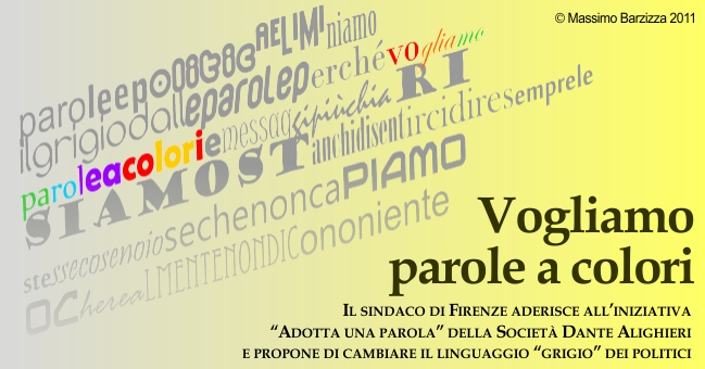«Basta. Dateci parole di passione, coraggio, bellezza. Fateci riscoprire che si può parlare di politica senza quel grigiume al quale ci avete abituato. Con parole chiare, semplici, facili», ha detto il Sindaco Renzi che, con il fine di criticare il linguaggio politico eccessivamente “grigio” e privo di chiarezza e semplicità, ha adottato il termine “propinare”, sinonimo di somministrare ma con valenza negativa, elencando una serie di espressioni che non vuole gli vengano più “propinate”, tra cui “cerniera intermodale”, “tavolo di concertazione” e “situazione contingente”. Alla luce dei dati emersi sul sito www.ladante.it, il successo di “Adotta una parola” è femminile (poco più di 10 mila adozioni maschili contro le quasi 12 mila richieste dalle donne), piuttosto giovane (il numero più alto di adozioni - circa 8 mila - si registra nella fascia di età compresa tra i 20 e i 29 anni, ma ben 3.500 sono le adesioni dei giovanissimi tra i 10 e i 19; tra i partecipanti spicca anche una persona ultranovantenne!) e italiano (sono state oltre 20 mila le adozioni nel nostro Paese, seguito da Svizzera, Spagna, Francia e Argentina). Per adottare una parola: http://adottaunaparola.ladante.it