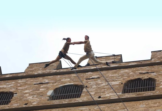 14 de junio de 2011. - La fachada del Palazzo Vecchio de Florencia fue durante 20 minutos la pista de baile para un espectáculo-desafío contra las leyes de la gravedad. Los protagonistas fueron dos parejas de bailarines (dos hombres y dos mujeres) que alrededor de las 8 pm de ayer dieron vida a un espectáculo único en la fachada principal del ayuntamiento. Utilizando sólo fuertes cuerdas de seguridad y un disfraz escénico ligero, bajaron colgando del pasillo de rondines del edificio a unas cuantas decenas de metros de altura y bailaron verticalmente, ejecutando piruetas y figuras artísticas sobre las antiguas piedras del edificio antes de descender al suelo entre los aplausos de los espectadores.
