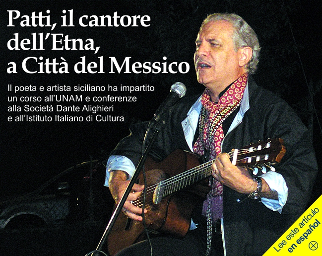 Alfio Patti. 17 dicembre de 2012 - Extraordinario éxito en la ciudad de México para “el cantor del Etna”, Alfio Patti, que contribuyó significativamente al incremento del interés local por la poesía regional italiana. Como Punto d'incontro online ya había anunciado el pasado 11 de octubre, estudiantes de la Universidad Nacional Autónoma de México (UNAM), Departamento de Letras Italianas de la Cátedra Extraordinaria Italo Calvino, siguieron con interés y participación las clases que el escritor, estudioso y apasionado de la poesía siciliana impartió en Ciudad Universitaria —el campus principal de la UNAM— en el contexto de un curso titulado “Allakatalla, cuando la palabra se hace poesía y la poesía canto”.