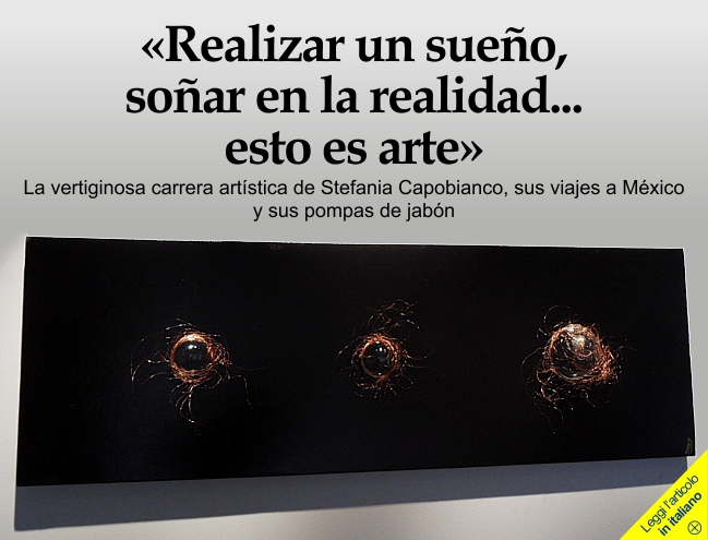 Stefania Capobianco. Eclipse. 20 de noviembre de 2012 - Stefania Capobianco cree en el arte, y sus obras son el resultado de esta fe. El tema recurrente en ellas son las pompas de jabón que recuerdan la ligereza y la infancia, el deseo de volver a ser niños y —con imaginación— seguir soñando. Nació como artista apenas en 2009 y con sus trabajos —técnicas mixtas sobre tela utilizando diferentes materiales— logra expresar y comunicar sentimientos y experiencias de vida. Está siempre en busca de nuevos materiales, estímulos y emociones para crear y, por esto, a menudo visita tierras lejanas. En Japón pudo confirmar, a través de la comparación con artistas locales, el gran trabajo que está realizando, mientras que en la Ciudad de México —impulsada por el deseo de conocer los lugares en donde nació Frida Kahlo— ha admirado en persona el arte mexicano, que la impactò al punto de programar un segundo viaje para diciembre de este año. Su primera exposición colectiva —la ocasión para mostrar, por fin, su trabajo a un público amplio— fue en 2011. Luego, en marzo de 2012, su primera muestra personal en la ciudad donde nació, Brescia. A partir de ahí comenzó el ascenso vertiginoso: en junio de 2012 una pequeña exposición en la galería de arte La Telaccia de Turín, seguida, en julio, por su participación en la Bienal de Monte Carlo que se llevó a cabo en las prestigiosas salas del Hotel de París. En septiembre en el Palacio Zenobio de Venecia expuso 4 obras en el evento Visiones en blanco y negro, pensamientos a colores. A partir del pasado 20 de octubre siete obras suyas se exponen en el Museo Magma de Caserta y —del 10 de enero al 4 de febrero del próximo año— participarà como artista en la Bienal de Palermo, que será inaugurada por Vittorio Sgarbi. En febrero, además, presentará sus obras en la Feria Dell'Arte de Innsbruck.