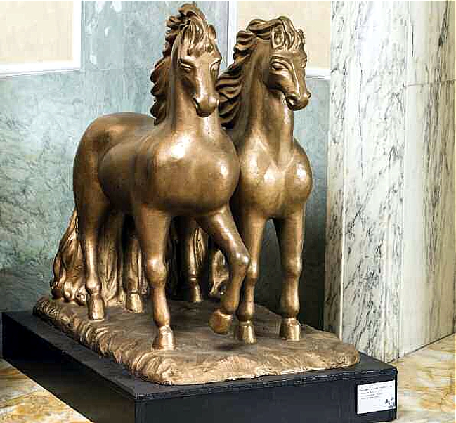 GIORGIO DE CHIRICO . El arte italiano desempeñó un papel crucial en el siglo pasado, tanto por el nivel de la tradición histórico-artística, como lo que respecta a la innovación más radical, entre Metafísica y Futurismo. Un puesto de honor en esta historia no pueden no tenerlo los hermanos Dioscuri Giorgio de Chirico y Alberto Savinio, destinados a peregrinar largo y tendido (Grecia,Munich, París, Milán, etc.), pero también a pararse en Roma; responsables según André Breton de la formación de lamitología moderna; pictor maximus el primero, músico, escritor genial y director teatral además de pintor marcado por la versatilidad el segundo. Durante toda su vida de Chirico indaga sobre la naturaleza del mito, mientras Savinio pasa su vida repitiendo la tragedia de la infancia en los lenguajes más diversos. Para ellos resulta fundamental la relación con el clasicismo al igual que lo fue para Arturo Martini y Marino Marini. Martini lleva a las últimas consecuencias la lingua morta (según el título de un libro suyo) de la escultura. Para el desarrollo de la escultura de Marini en los años Cuarenta reviste gran importancia el ciclo de las Pomone, iniciado ya en 1935, símbolos femeninos de la fecundidad. Otroitalien de Paris, exponente de Valori Plastici y luego de Novecento es Mario Tozzi. En Roma había estudiado ingeniería Mario Sironi, que se convierta en el principal protagonista, también desde el punto de vista teórico (enfoca la importancia de la relación con la ciudad a través de la actividad de decoraciónmural), del retorno al orden clásico, a formas arcaicas con una geometría esencial. En la posguerra vemos el arte italiano ocupado en la batalla entre la figuración capitaneada por Renato Guttuso (del cual vemos aquí un retrato del escritor Goffredo Parise, que vivió muchos años en Roma) y los jóvenes del grupo Forma, seguidores del abstractismo; y el campo de esta batalla es justo Roma. Al lado de Attardi (que más tarde mitigará sus furores abstractos), Dorazio, Perilli, Consagra, Maugeri, Guerrini, Sanfilippo y Giulio Turcato ,encontramos también una grande protagonista femenina: Carla Accardi. En 1954 la Accardi encuentra “su” signo con la fuerza de pintar en el suelo. Turcato perseguirá los colores hasta “más allá del espectro”. Los trazos ligeros de Gastone Novelli aproximan la pintura a la escritura.