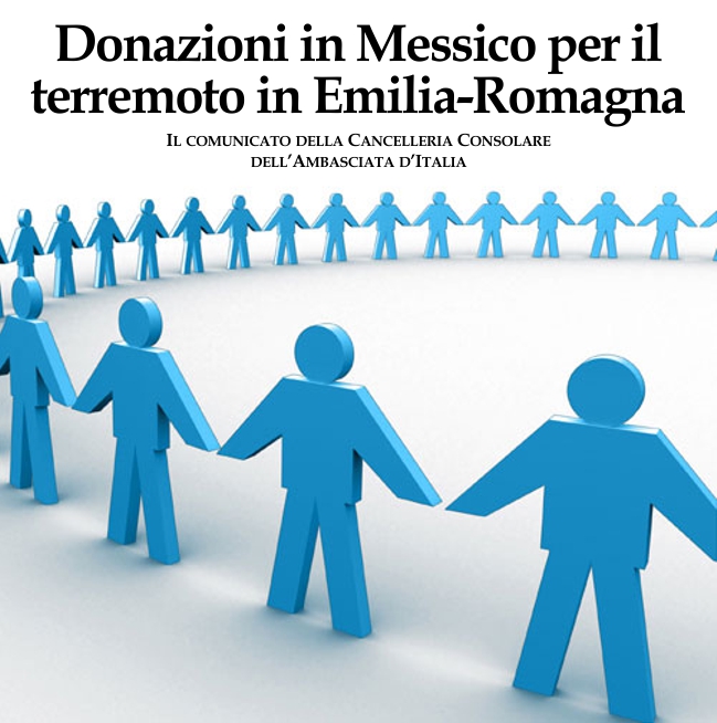 5 giugno 2012. - Al fine di consentire eventuali donazioni in favore delle regioni colpite dal terremoto, sono stati aperti diversi conti correnti bancari in Italia (vedasi elenco allegato) sui quali potranno essere effettuati dei versamenti specificando la causale "terremoto Emilia", se non diversamente specificato. Questa Ambasciata, inoltre, con lo scopo di facilitare i piccoli versamenti da parte della Comunità Italiana, delle Associazioni e dei singoli cittadini italiani e messicani, ha aperto due conti provvisori ad hoc, per i quali le Banche aderenti hanno offerto la massima disponibilità e garantito l'assoluta gratuità delle operazioni. Quanti vorranno versare anche un piccolo contributo in favore delle popolazioni dell'Emilia colpite dal terremoto, potranno farlo tramite questi due conti anche solo con piccole somme e specificando sempre la causale "terremoto Emilia". I fondi raccolti saranno trasferiti in favore della protezioni civile italiana, perché ne determini il miglior uso.