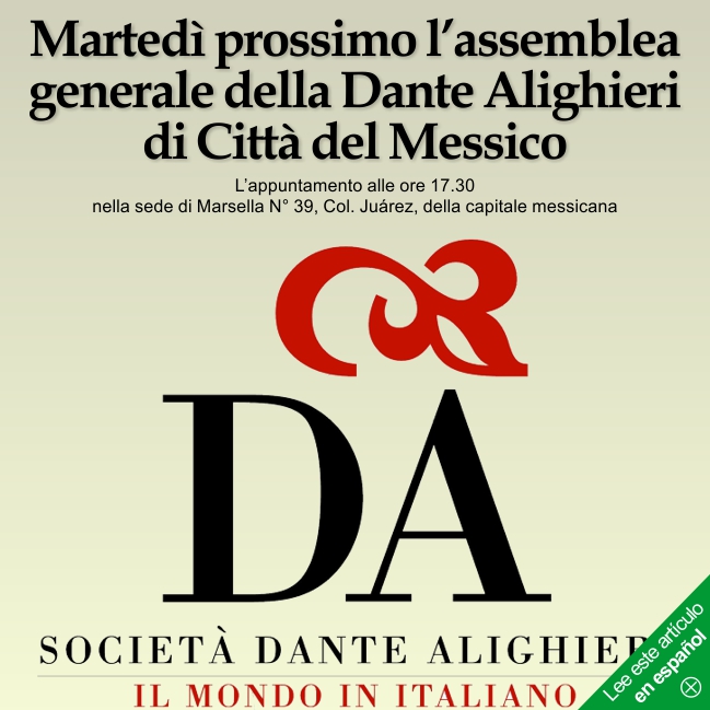 10 marzo 2013 - Ho il piacere di informarVi che quest'anno la nostra Assemblea Generale Annuale si terrà martedì 12 Marzo 2013 alle ore 17:30 in prima convocazione e in seconda convocazione alle ore 18.30 presso la nostra sede di Marsella n° 39, Col. Juárez, México D.F. 06600 (Città del Messico). Spero che possiate accompagnarci in persona e poter assistere così al resoconto di tutte le attività che, grazie al vostro aiuto e a quello di tutti i Consiglieri, sono state realizzate nel 2012 e che stiamo programmando per il 2013. La vostra partecipazione sarà la migliore testimonianza del grande interesse con il quale continuate a seguire le nostre attività e, questa volta, avrà un significato particolare in quanto l'Assemblea Generale eleggerà due nuovi Consiglieri per occupare i posti lasciati vacanti dal signor Mauricio Canineo —che per motivi di lavoro è tornato in Brasile— e dal C.P. Ricardo González, che è stato costretto a dimettersi a causa delle nuove responsabilità che gli sono state assegnate in qualità di Direttore del Campus Reforma dalla Scuola Bancaria Commerciale (EBC). Colgo l'occasione per augurare all'Ing. Canineo e al C.P. González —a nome mio, del Consiglio Direttivo e di questa Assemblea Generale— ogni successo nello svolgimento delle loro attività e ringrazio il prezioso supporto che hanno dato alla Società Dante Alighieri. Se i Vostri impegni vi impedissero di assistere Vi sarei grato se ci poteste inviare inviare una procura originale il più presto possibile, compilando il modulo allegato. Vi ricordo che ogni socio può ricevere una sola delega per cui è importante che prima di redigerla controlli che la persona interessata non ne abbia già ricevuta un'altra. Approfitto dell'occasione per richiedere la Vostra cortese collaborazione, se non l'avete già fatto, per coprire l'importo della quota associativa.
