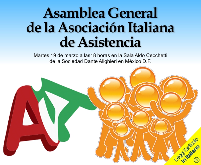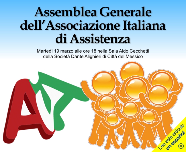 12 marzo 2013 - Cari soci e amici, Vi invito a partecipare alla nostra Assemblea Generale Ordinaria annuale che quest'anno avrà luogo martedì 19 marzo nella Sala Aldo Cecchetti della Società Dante Alighieri di Città del Messico, che ogni anno ci ospita gentilmente. Vi ricordo che per partecipare e votare gli interessati dovranno essere al corrente con il pagamento delle quote sociali, ed a tal fine si allega il modulo di iscrizione 2013. Alleghiamo, inoltre, la procura che offre la possibilità di farsi rappresentare in caso di impedimento. Colgo l'occasione per invitarvi anche alla “Domenica Italiana”, evento che la AIA organizza annualmente e che in questa occasione si terrà presso lo splendido Istituto Italiano di Cultura domenica 14 aprile. Potrete gustare un buffet di cucina italiana fatta in casa preparata dai volontari della nostra comunità in Messico, oltre a vari intrattenimenti per grandi e piccini. All'evento potranno partecipare un massimo di 300 persone, per cui consigliamo ai nostri soci e amici che prenotino in anticipo. Arrivederci il 19 marzo! Cordiali saluti, Regina Casalini