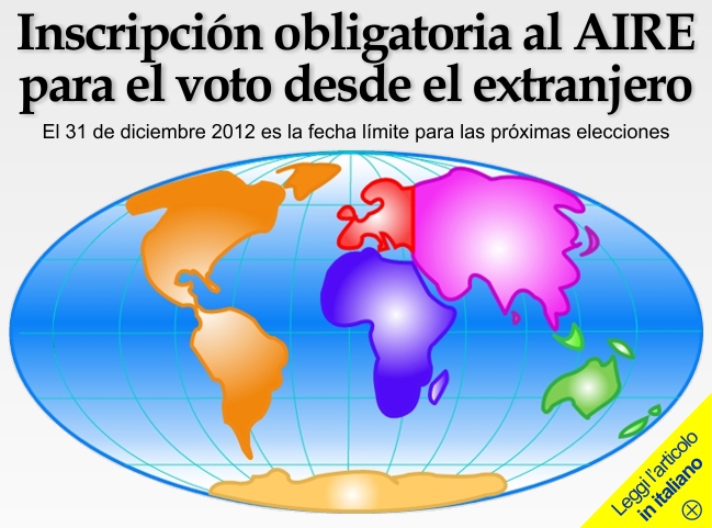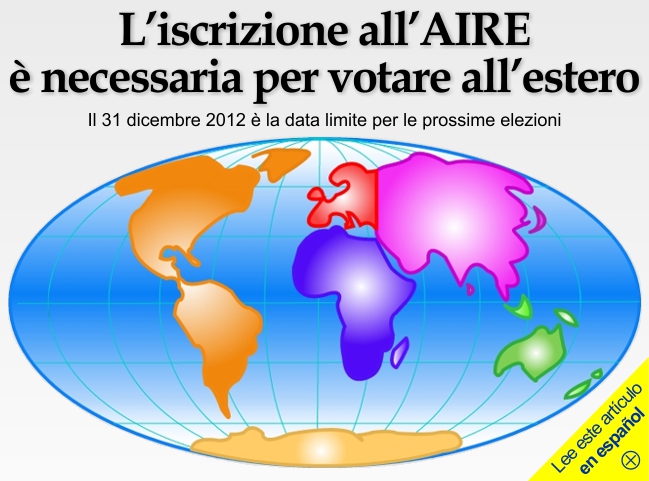 10 de diciembre de 2012 - El año que viene todos los italianos volverán a votar, probablemente entre febrero y marzo. En espera de la fecha de la elección, es conveniente recordar que los que viven en el extranjero pueden votar por correo, siempre y cuando se hayan debidamente inscrito al A.I.R.E. (Anagrafe Italiani Residenti all'Estero o Registro Civil de los Italianos Residentes en el Extranjero) a más tardar 31 de diciembre del año anterior a las elecciones. Así, el próximo 31 de diciembre de 2012 es la fecha límite para registrarse para los compatriotas que aún no lo hayan hecho. Esta inscripción —obligatoria para los que residen permanentemente en el extranjero— otorga, entre otras cosas, el derecho al voto por correo para los candidatos de la jurisdicción del extranjero. El Ministerio del Interior, sobre la base de los datos proporcionados por los municipio acerca del A.I.R.E. es el encargado de preparar el padrón electoral de los votantes italianos en el extranjero. Sólo a ellos les llegará el material necesario para votar por correo. Y por esto es igualmente importante actualizar sus datos en los Consulados, por ejemplo en caso de cambio de dirección. Le recordamos además que 31 de diciembre es la fecha límite para el ejercicio del derecho de opción: el residente en el extranjero puede —de hecho— decidir no votar por correo para la jurisdicción extranjera, sino volver a Italia y votar en la circunscripción del territorio nacional donde está inscrito. En este caso será necesario llenar un formulario - publicado hace unos días por Punto d'incontro online - que deberá ser enviado a la oficina consular antes del 31 de diciembre.