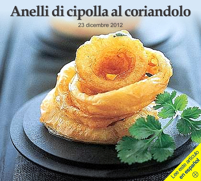 cilantro picado, sumerjan en ella rápidamente los aros de cebolla y fríanlos