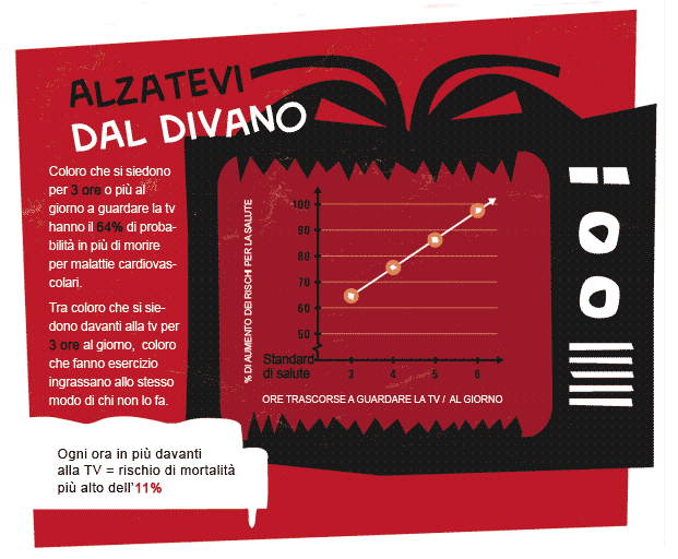 Noi ve la presentiamo opportunamente tradotta: apprenderete che tre ore di televisione spaparanzati sul divano annullano qualsivoglia fatica in palestra. Che mentre sudiamo alla scrivania, il nostro corpo è inerte. E che se proprio siamo costretti a non muoverci, perchè il nostro lavoro ce lo impone, alzarsi anche per un minuto e farsi il periplo dell'ufficio, aiuta. Perchè chi si siede è perduto.