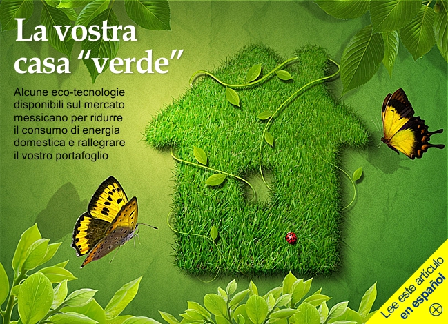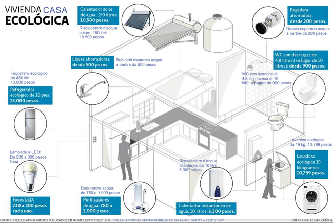 I calcoli degli esperti indicano che le cosidette eco-tecnologie consentono di risparmiare fino al 70% del consumo di gas, ridurre la bolletta della luce e diminuire la spesa per l'acqua potabile da 2,280 a circa 780 pesos l'anno. Ecco, di seguito, alcune eco-tecnologie disponibili sul mercato. GAS Uno scaldabagno solare assistito da uno scaldaacqua istantaneo. Lo scaldabagno istantaneo risparmia, da solo, gas ed energia elettrica all'attivarsi solo quando esiste richiesta di acqua calda. Ma può diventare ancora più efficace con l'aiuto di un riscaldatore solare. Secondo Porfirio Hernandez, responsabile del dipartimento di sostenibilità di Mi Ecocasa —ditta specializzata in eco-tecnologie— il riscaldamento solare permette un risparmio immediato che può raggiungere il 70% nel consumo di gas. «Questo perché il riscaldamento solare preriscalda l'acqua che passa attraverso lo scaldabagno istantaneo, in modo che quest'ultimo utilizza meno gas per aumentare la temperatura dell'acqua a 40 gradi Celsius» spiega. E allora, perché non basta uno scaldabagno solare? A questo proposito Aline Cortés chiarisce che il pannello solare è in grado di catturare l'energia luminosa anche durante giornate nuvolose o piovose, ma la temperatura dell'acqua sarà inferiore a quella ottenuta con giornate di sole. «Per poter fare la doccia alla temperatura abituale e diminuire il consumo di gas, si consiglia l'installazione di ambedue». Il prezzo di un riscaldatore solare da 150 litri (sufficiente per cinque docce) varia tra i 10.000 e i 12.500 pesos, mentre los scaldabagno istantaneo da 10 litri costa circa 6.000 pesos. Alcuni negozi vendono già kit con entrambi. Assicuratevi, però, che non siano più costosi che comprandoli separatamente. ACQUA I rubinetti risparmio acqua dovranno essere installati nella doccia, nel lavandino e nel lavello della cucina per ridurre il consumo fino al 40%, dato che espellono acqua e aria, spiegano gli specialisti. Il loro prezzo varia notevolmente secondo i materiali utilizzati e i marchi. Se ne possono trovare da 300 a 3.000 pesos ciascuno. Lavatrice. Per quanto riguarda le lavatrici ci sono due fattori da cercare: risparmio d'acqua e di energia elettrica. Secondo dati di Mabe, per ogni carico si consumano in media 200 litri d'acqua, ma un apparecchio a risparmio energetico be utilizza solo 80. Inoltre, la domanda di energia elettrica di un modello comune è 80-100% superiore. Per trovare elettrodomestici più efficienti nell'uso di energia elettrica e acqua, cercate qualsiasi dei marchi seguenti: 1. Fide: è un badge che viene dato ai prodotti che, direttamente o indirettamente, risparmiano elettricità. Per un elenco degli apparecchi consultate il sito web e cliccate sul menu etichetta Fide (sello Fide): www.fide.org.mx/ 2. Timbro di qualità certificata biologica rilasciato dall'Associazione di Standardizzazione e Certificazione (Asociación de Normalización y Certificación AC): per i prodotti che utilizzano efficientemente luce e e acqua. Potete vedere qui l'elenco dei prodotti: www.ance.org.mx. Esistono attualmente su mercato messicano elettrodomestici di marca Samsung, Mabe, Whirlpool e LG con questi marchi.