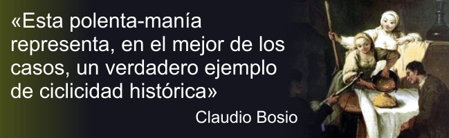 Ya prácticamente desaparecida de nuestras mesas antes de este último regreso, la polenta es un alimento que durante siglos quitó el hambre (¡literalmente!) a generaciones enteras de italianos. Ha sido, sin lugar a dudas, “el” platillo siempre presente en las mesas de mucha gente pobre. Polenta a mediodía, en la noche, e incluso en la mañana, como desayuno. Polenta, más polenta y sólo polenta. Los italianos comedores de polenta (los llamados “polentoni”) han sido y todavía son… los norteños (piamonteses, lombardos, vénetos y friulanos, en particular). “Polentone” (forma despreciativa para indicar a un habitante del norte de Italia), es un término originado por la eterna rivalidad entre el norte y el sur de nuestro país, utilizado, como se sabe, en contraposición al apelativo “terrone” (forma despreciativa para indicar a los sureños). Ambas palabras, en el lenguaje común, son de connotación casi racista y fuertemente discriminatorias. Son palabras de desprecio hacia la contraparte (norteña o sureña) contra la cual se presume una superioridad étnica y/o cultural.