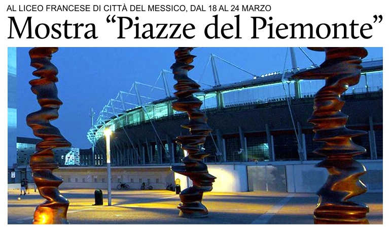 17 marzo 2014 - La mostra “Piazze del Piemonte” —promossa dal Consiglio Regionale del Piemonte e dall'Associazione dei Piemontesi nel Mondo— sarà nel liceo francese di Città del Messico dal 18 al 24 marzo e sabato 22 sarà aperta al pubblico dalle ore 10 alle 18 per i festeggiamenti della “Fêtes des arts”, la settimana dell'arte e della cultura.