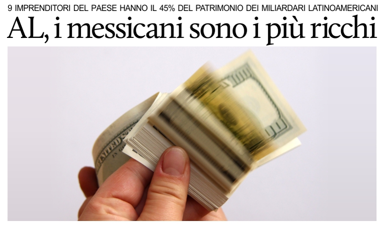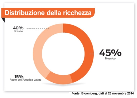 20 gennaio 2015 - Il patrimonio dei miliardari è più concentrato in Messico che in Brasile, dato che nove degli imprenditori più ricchi del Paese degli Aztechi possiedono il 45 per cento del valore totale della ricchezza dei multimilionari in America Latina, mentre nel gigante carioca 18 imprenditori controllano il 40,6% delle risorse degli straricchi del subcontinente, riconosce Blake Schmidt.