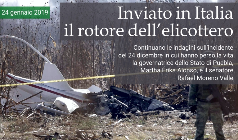 24 gennaio 2019 - Il processo investigativo del disastro aereo del 24 dicembre nello Stato di Puebla —in cui hanno perso la vita 5 persone, tra cui la governatrice Martha Erika Alonso e il senatore Rafael Moreno Valle— è in fase di invio dei componenti a vari laboratori internazionali per le analisi. Il governo federale messicano ha mandato in Italia all'Agenzia nazionale per la sicurezza del volo (ANSV) i sistemi di trasmissione e il rotore principale dell'elicottero AgustaWestland AW109S Grand che, secondo le dichiarazioni dei funzionari del Ministero delle Comunicazioni e dei Trasporti, è precipitato in forma «insolita». Gli altri enti coinvolti nelle indagini sono la Transportation Safety Board del Canada, l'Agenzia europea per la sicurezza aerea e la National Transportation Safety Board degli Stati Uniti. Il Sottosegretario dei Trasporti, Carlos Morán Moguel, ha affermato che una volta completata l'analisi, i risultati verranno inviati alle autorità competenti di ciascun Paese e alla Direzione generale dell'aviazione civile (DGAC) del Messico, per l'integrazione della pratica e la produzione del rapporto finale. «Da parte dell'agenzia europea per la sicurezza aerea», ha spiegato Morán, «è venuto in Messico Mario Colavita, uno dei principali esperti in Europa, che ha coordinato, inoltre, la presenza dalle autorità indipendenti dell'ANSV provenienti dall'Italia, il Paese produttore dell'elicottero». «L'agenzia italiana per la sicurezza del volo», ha continuato il funzionario, «ha inviato due persone, Barbara Nassi e Giorgio Dossena, che hanno avuto la collaborazione di Said Torres, di Leonardo elicotteri. C'è stato uno speciale interesse del governo italiano affinché Mikael Amura, esperto in inchieste sugli incidenti, coordinasse le attività legate a questo caso». (massimo barzizza / puntodincontro.mx)