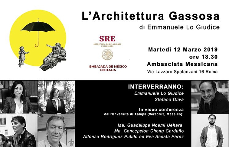 10 marzo 2019 - Martedì 12 marzo, presso l'Ambasciata del Messico a Roma, avrà luogo alle ore 18:30 la conferenza “L'Architettura Gassosa” a cura di Emmanuele Lo Giudice e Stefano Oliva. Interverranno tramite un collegamento video dalla Facoltà di Architettura dell'Università Veracruzana di Xalapa —capitale dello Stato messicano di Veracruz— i docenti María Concepción Chong Garduño, Eva Acosta Pérez, María Guadalupe Noemi Uehara e Alfonso Rodríguez Pulido. “Architettura Gassosa, per un nuovo realismo critico” è un manifesto grafico dell'architetto, artista e designer palermitano Emmanuele Lo Giudice, nel quale viene illustrata una interessante teoria per l’architettura contemporanea, che vuole dare una risposta alle trasformazioni che la società sta vivendo in questi ultimi decenni. «Il concetto» —ha spiegato Lo Giudice a Puntodincontro— «è stato presentato per la prima volta ad aprile 2018 in Messico, in un congresso internazionale, e a novembre in Italia con un seminario ed un workshop alla 16ª Biennale di Architettura di Venezia nel padiglione spagnolo di Axtu Amann, con la partecipazione di alcuni studenti e professori dell’Università di Xalapa».