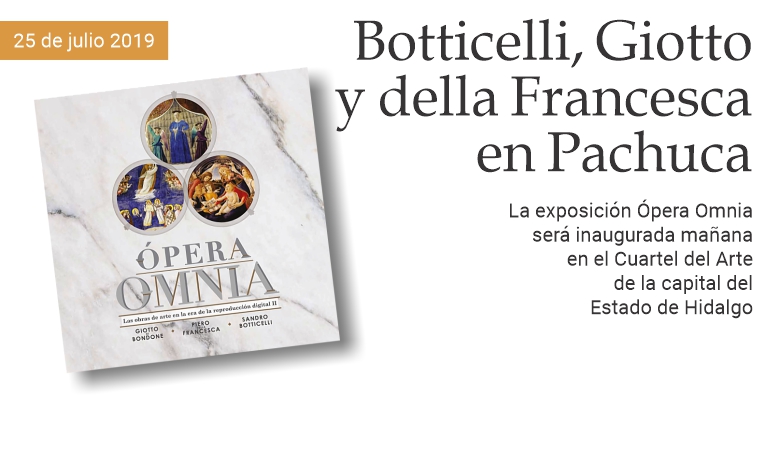 25 de julio de 2019 - Mañana, viernes 26 de julio a las 19:00 horas, será inaugurada en el Cuartel del Arte de Pachuca de Soto la exposición Ópera Omnia, con reproducciones en alta resolución y tamaño natural de 60 pinturas de tres grandes artistas del Renacimiento italiano: Giotto di Bondone (1267-1337), Piero della Francesca (1412-1492) y Sandro Botticelli (1446-1510). La muestra es organizada por la Radio televisione italiana (RAI), en colaboración con la Secretaría de Cultura federal mexicana y el Centro Nacional de las Artes (CENART). Asistirán a la ceremonia Omar Fayad Meneses, gobernador del Estado de Hidalgo, Alejandra Frausto Guerrero, Secretaria de Cultura federal, María de los Ángeles Castro Gurría, directora general adjunta del Centro Nacional de las Artes y Riccardo Cannelli, experto del Instituto Italiano de Cultura. «Las obras de la exposición estuvieron expuestas con gran éxito [hasta el 21 de junio, nota del redactor] en el CENART de la Ciudad de México», dijo a Puntodincontro Simone Landini, encargado de negocios de la Embajada de Italia. (massimo barzizza / puntodincontro.mx)