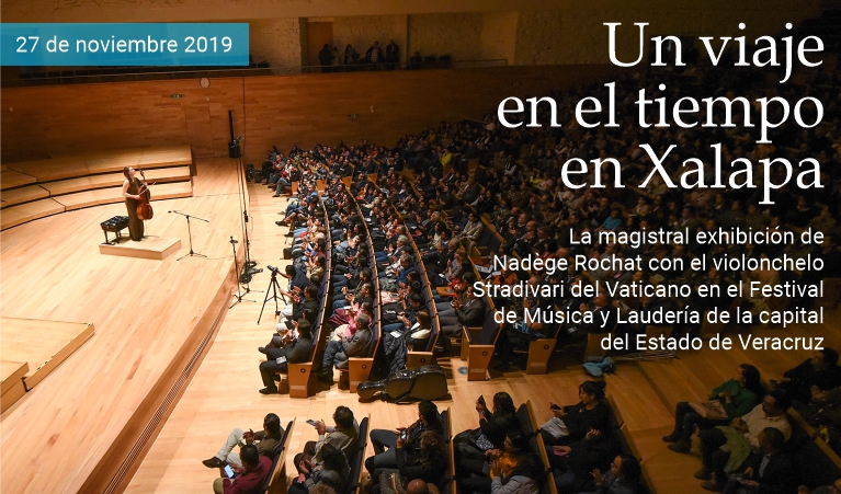 27 de noviembre de 2019 - La violonchelista Nadège Rochat llamó «viajero del tiempo» al chelo con el que interpretó magistralmente el jueves de la semana pasada en la Sala Tlaqná de Xalapa el concierto Entre el viejo y el nuevo mundo, con piezas de J.S. Bach, G. Cassadó y Henri Dutilleux. La definición es absolutamente correcta: el instrumento —hoy propiedad de la Academia de Arte de Florencia (AAF)— fue construido entre 1620 y 1650 por el maestro laudero Nicola Amati como viola de gamba y transformado en violonchelo en 1703 por Antonio Stradivari. A mediados del siglo XIX, el fabricante francés George Chanot pintò dos ornamentos con ángeles y motivos religiosos en su parte frontal y adornó el lado posterior con un sello papal, convirtiéndolo así durante 100 años en el chelo oficial del Vaticano. Perdurará en el tiempo, sin embargo, también el recuerdo y el legado del primer Festival de Música y Laudería de Xalapa, que se llevó a cabo del 18 al 22 de noviembre con una importante participación de Italia y del cual la exhibición de Nadège fue uno de los eventos principales. Antes del concierto, el alcalde de la capital veracruzana, Hipólito Rodríguez, subió al escenario acompañado, entre otras personalidades, por Fabio Caselli, presidente y rector de la AAF, Othón Leopardi, presidente de la Sociedad Dante Alighieri y Riccardo Caffarella, miembro de la Asociación de Investigadores Italianos en México.