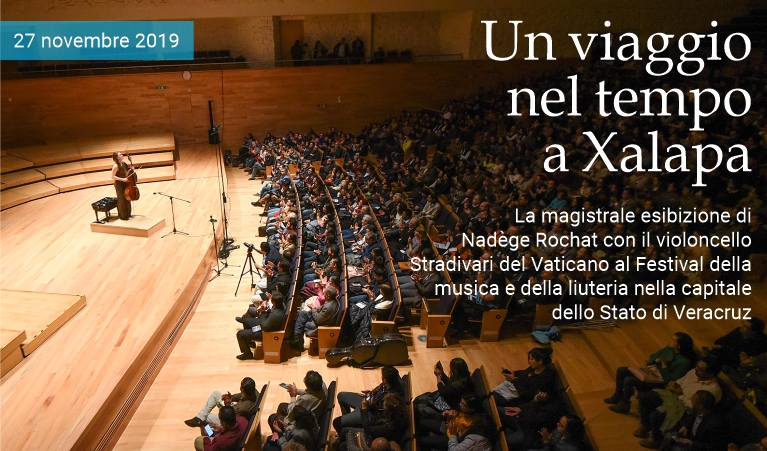 27 novembre 2019 - La violoncellista Nadège Rochat ha chiamato «viaggiatore nel tempo» il cello con cui ha interpretato magistralmente giovedì scorso nella Sala Tlaqná di Xalapa il concerto Entre el viejo y el nuevo mundo (Tra il vecchio e il nuovo mondo), con brani di J.S. Bach, G. Cassadó e Henri Dutilleux. La definizione è assolutamente corretta: lo strumento —ora di proprietà dell'Academia de Arte de Florencia (AAF)— fu costruito tra il 1620 e il 1650 dal maestro liutaio Nicola Amati come viola da gamba e trasformato in violoncello nel 1703 da Antonio Stradivari. A metà del XIX secolo, il fabbricante francese George Chanot dipinse due fregi con angeli e motivi religiosi sul lato frontale e ornò il retro con un sigillo papale, rendendolo così per 100 anni il violoncello ufficiale del Vaticano. Ma senza dubbio rimarranno impressi nel tempo anche la memoria e il legato del primo Festival della musica e della liuteria di Xalapa, svoltosi dal 18 al 22 novembre con un'importante partecipazione italiana e di cui l'esibizione di Nadège è stata uno degli eventi principali. Prima del concerto, il sindaco della capitale dello Stato di Veracruz, Hipólito Rodríguez, è salito sul palcoscenico accompagnato, tra le altre personalità, da Fabio Caselli, presidente e rettore dell'AAF, Othón Leopardi, presidente della Società Dante Alighieri e Riccardo Caffarella, membro del Associazione dei ricercatori italiani in Messico.