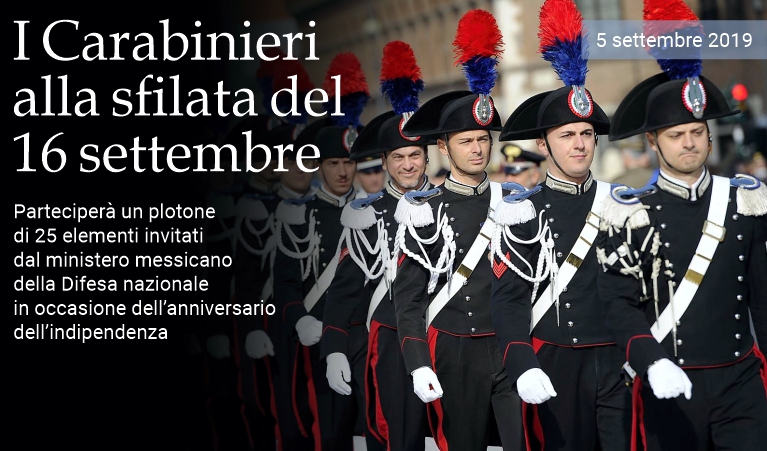 5 settembre 2019 - Lunedì 16 settembre in Plaza de la Constitución a Città del Messico un plotone di rappresentanza composto da 24 Carabinieri —cadetti allievi della Scuola marescialli e brigadieri— e un ufficiale dell’Ufficio Cooperazione Internazionale del Comando Generale sono stati invitati e parteciperanno alla sfilata che il ministero messicano della Difesa nazionale organizza in occasione delle celebrazioni del 209º anniversario dell'indipendenza del Paese. Prenderanno parte all'evento anche rappresentanti delle forze dell'ordine di altre nazioni, tra cui Argentina, Cile, Spagna, Polonia e Portogallo. La Guardia Nazionale (GN) guiderà la formazione con elementi di prossimità sociale, elementi operativi e la banda di guerra, oltre a gruppi a cavallo e motorizzati. Luis Rodríguez, comandante della GN, ha dichiarato che la tradizionale parata militare vedrà impegnati 4,637 membri di questa istituzione. (massimo barzizza / puntodincontro.mx)