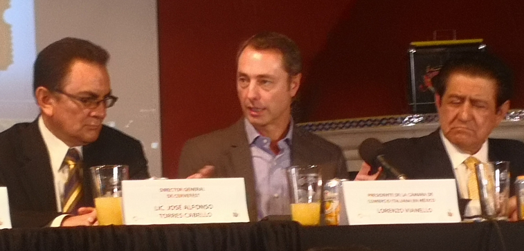 Da sinistra, José Alfonso Torres Cabello, Lorenzo Vianello e Armando Bojórquez Patrón durante la conferenza stampa. «La Camera di commercio italiana» —ha aggiunto Vianello— «mira a rafforzare le relazioni economiche tra i nostri Paesi e nei tre giorni della fiera avremo una buona partecipazione con diversi espositori, tra cui spiccano Caulier, importatore della birra artigianale Toccalmatto —la più importante nel suo tipo dello Stivale—, Doce Columnas, importatore della birra artigianale Baladin oltre a Peroni e Nastro azzurro —due delle più antiche birre industriali della nostra terra—, Impresit, anche loro con birra artigianale, e Impoveneto, con Birra Poretti». «Ci saranno anche importatori e produttori di alimenti come Los Sabores del Chef Giuseppe —con pasta, lasagne, limoncello, ecc.—, Porkit, con la loro porchetta —un piatto tipico dell'Italia centrale a base di carne di maiale—, gelati di Frozzeto e pasta fresca dello Chef Mauricio della Trattoria Palacio. Giuseppe Miele, della Piccola Trattoria —un punto di riferimento per chi mangia la pizza a Polanco—, preparerà panini con salsicce aromatizzate con un'erba tipica napoletana e, infine, Joshua Serrano —vincitore nel 2017 del Campionato messicano della Pizza— preparerà la pizza fritta». L'ottava edizione della Feria Internacional de la Cerveza si terrà il 15, 16 e 17 marzo 2019 presso il Deportivo Club Acalli, Camino Viejo a Cuemanco S / N, Col. Barrio Concepción Tlacoapa, C.P. 16034, Xochimilco Città del Messico. Gli organizzatori prevedono la partecipazione di circa 30 mila persone durante il fine settimana. (massimo barzizza / puntodincontro.mx)
