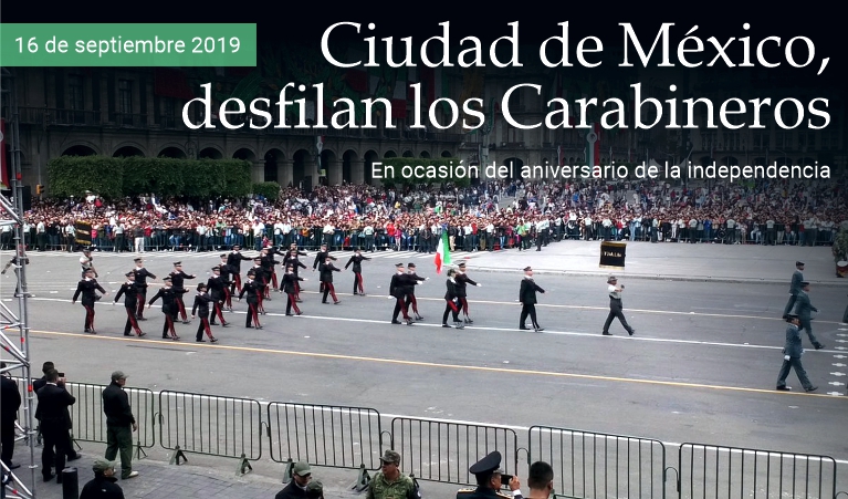 16 de septiembre de 2019 - Participó hoy en el desfile militar del día de la Independencia de México el pelotón de 24 carabineros invitados por la Secretaría de la Defensa Nacional del país latinoamericano. Por primera vez durante su mandato, el presidente de la república López Obrador encabezó el evento como comandante en jefe de las fuerzas armadas, en conmemoración del 209 aniversario del grito de Dolores, el acto que según las tradiciones dio inicio a la guerra de independencia. Durante una hora y 40 minutos recorrieron las calles de la plaza de la Constitución 55 banderas mexicanas y seis extranjeras (Italia, Argentina, Chile, Polonia, Portugal y España) con un total de 13 mil 111 participantes.
