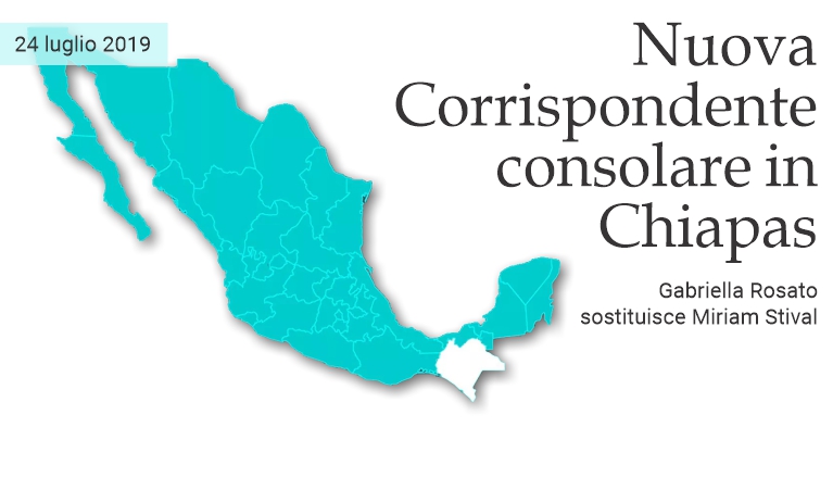 24 luglio 2019 - L'Ambasciata d'Italia in Messico ha reso noto oggi che la Dott.ssa Gabriella Rosato è stata nominata Corrispondente consolare onoraria nello Stato di Chiapas in sostituzione di Miriam Stival. I recapiti della Dott.ssa Rosato sono i seguenti: