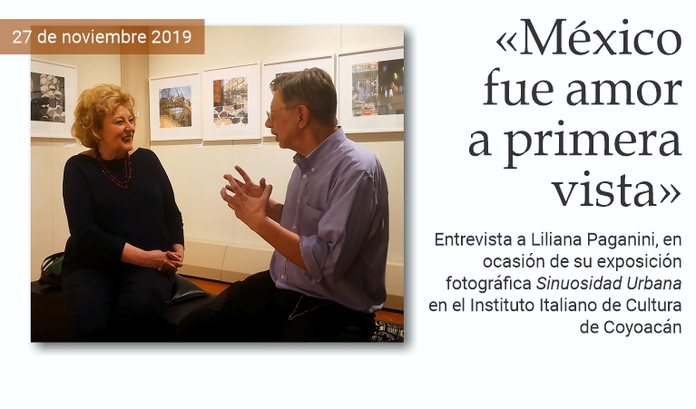 27 de noviembre de 2019 - Actriz, pintora y escritora, ganadora de varios reconocimientos internacionales, Liliana Paganini experimenta a nivel expositivo por primera vez con la fotografía —inspirada por la Ciudad de México— a través del montaje de su muestra Sinuosidad Urbana, que permanecerá abierta al público hasta el 12 de enero de 2020 en el Instituto Italiano de Cultura de Coyoacán. La instalación está compuesta por 46 obras constituida cada una por dos fotos unidas y se desarrolla en dos secciones: “Sinuosidad Urbana” y “Fuga en la Noche”, que incluye un video-arte. Visitando México, entre monumentos, mercados, calles y lugares populares o elegantes —comparando lo que ven los ojos y lo que ve el corazón— la artista italiana recreó la realidad que percibía en el diálogo secreto de las imágenes, que se ensamblan, plasmando nuevas formas. Hace unos días, Liliana concedió una breve entrevista a Puntodincontro, que reproducimos a continuación: Esta es tu primera exposición fotográfica. Si, es increíble. He hecho muchas exposiciones de pintura, principalmente de acuarelas, y ahora me encuentro haciendo una exposición de fotografía... en México... Una nueva experiencia, entonces. ¿Cómo nació la idea? Nació porque tenía un vacío expositivo muy grande y quería hacer una muestra sobre la Ciudad de México, tratando de transmitir mis sentimientos acerca de esta metrópoli. Las acuarelas que suelo hacer son pequeñas y nunca habría podido pintar suficientes en dos meses, cosa que sí me fue posible con fotos. México es una experiencia relativamente nueva para ti, porque viniste aquí por primera vez hace un año, ¿no es así? El año pasado, sí. Ya casi un cumpleaños. Pero este año he venido varias veces, esta es la quinta. México para mí fue amor a primera vista. ¿Qué representa México para ti en este momento? Me gusta. Realmente me encanta este país. Me gusta mucho la ciudad de México, me parece muy estimulante. Es una urbe con muchas contradicciones, muy diversa. Pasas de las cosas más trash al refinamiento absoluto. Me gustan los mexicanos y el clima es perfecto para mí. ¿Crees que en este país puede haber nuevos desarrollos en tu carrera como actriz, pintora, escritora y fotógrafa? Me gustaría mucho eso. El año pasado tradujimos uno de mis monólogos al español y ahora, desde Guadalajara, recibí una solicitud para otro artículo sobre el tema de la violencia contra las mujeres y también será traducido. Además, como tutor, fui curadora de la traducción de autores españoles al italiano. El profesor Tedeschi de la Universidad Sapienza de Roma se encargó de esto y le pidió a sus alumnos que hicieran la traducción. Nosotros dramaturgos, en grupo, apoyamos a los muchachos, para guiarlos en la redacción del lenguaje teatral, que es el lenguaje hablado, no sólo leído. Gracias y esperamos verte aquí con la mayor frecuencia posible. Yo también espero lo mismo, gracias.