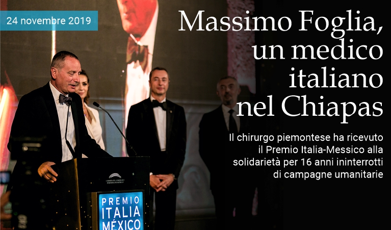 24 novembre 2019 - Giovedì 14 novembre si è svolta l'undicesima edizione del Premio Italia-Messico, evento annuale organizzato dalla Camera di commercio italiana (CCIM) al fine di riconoscere il lavoro di aziende e individui che contribuiscono a rafforzare i legami tra le due nazioni. In questa occasione, il riconoscimento alla solidarietà è stato consegnato —dal presidente della CCIM Lorenzo Vianello e dall'ambasciatore d'Italia Luigi De Chiara— al Dott. Massimo Foglia, con la seguente motivazione: «per aver contribuito a progetti di sostegno solidale in Messico negli ultimi 16 anni. Ne è una prova la creazione del primo gruppo di supporto sanitario ad Altamirano, nello Stato del Chiapas, a beneficio della popolazione più vulnerabile di quella zona, portando avanti campagne di supporto professionale volontario in ginecologia e urologia».