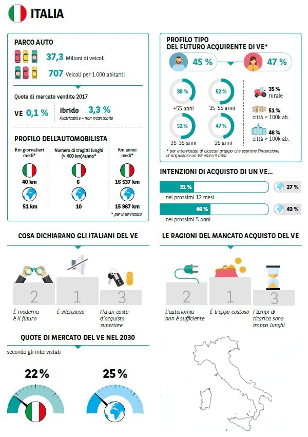 14 luglio 2019 - L'Osservatorio Auto Findomestic —creato nel 1994 da una delle principali società nel mercato italiano del credito al consumo— ha interrogato sull'auto elettrica —raccogliendo anche dati statistici sul parco auto e il profilo dei conducenti— un campione di automobilisti in 16 Paesi del mondo, tra cui Italia e Messico. Risalta, in primo luogo, il contrasto riflesso dal numero di veicoli per ogni 1.000 abitanti, dove la cifra italiana supera di 130% quella del Paese latinoamericano, in cui una gran parte della popolazione non possiede le risorse sufficienti per acquistare e mantenere un'auto. È da sottolineare, inoltre, il dato relativo al numero di tragitti superiori ai 400 km: qui gli automobilisti messicani raggiungono cifre molto più alte di quelle degli italiani e riportano 28 viaggi all'anno, quasi cinque volte di più dei 6 registrati dai conducenti del Bel Paese. Le dimensioni, la relativamente bassa densità di popolazione del Messico rispetto all'Italia e la mancanza in terra azteca di una rete ferroviaria per trasporto passeggeri spiegano queste grandi differenze. Per quanto riguarda invece le domande sui veicoli elettrici, nello Stivale, contrariamente al nord Europa, gli intervistati hanno dimostrato una forte fiducia nei confronti del futuro di questo mezzo di trasporto, sebbene le loro risposte prevedano una quota di mercato più debole nel 2030 rispetto alla media mondiale. Molti italiani dichiarano di conoscere il funzionamento di un'auto elettrica, ma le loro preferenze si inclinano nettamente a favore dei veicoli ibridi. Sono, comunque, numerosi gli intervistati del Bel Paese che hanno indicato la necessità di maggiori sovvenzioni pubbliche in questo campo. Interessanti i risultati per il Messico: la nazione latinoamericana è in testa alla classifica per quanto riguarda l'ottimismo nei confronti dei veicoli elettrici. Anche l'intenzione di acquisto a 5 anni dei messicani è la più elevata dell'intero campione, seppur debole su un orizzonte temporale di 12 mesi. Il Paese possiede la quota più ampia di intervistati che ritengono il veicolo elettrico troppo costoso, ma sono anche i più disposti a compiere uno sforzo aggiuntivo per acquistarne uno rispetto a un veicolo termico. Riportiamo di seguito le intenzioni di acquisto e le ragioni per il non acquisto di un veicolo elettrico espresse dagli automobilisti in Italia e in Messico, assieme alle informazioni sul parco auto e il profilo dei conducenti. I dati completi del sondaggio per le altre 14 nazioni possono essere consultati al seguente link: http://www.osservatoriofindomestic.it/osservatorio-auto/osservatorio-auto-2019.html#C6928A6F-1117-C998-C84F-BF1EB55BC624.
