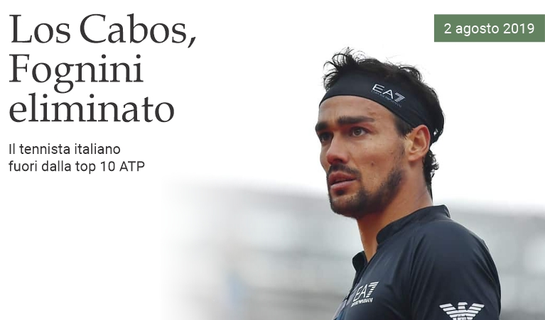 2 agosto 2019 - Fabio Fognini è stato eliminato con parziali di 1-6 e 6-7 ai quarti di finale del torneo di Los Cabos, in Messico, dove l'azzurro difendeva il titolo vinto 12 mesi fa. Dopo la vittoria di mercoledì contro lo spagnolo Marcel Granollers, il 32enne di Arma di Taggia è stato battuto piuttosto nettamente dallo statunitense Taylor Fritz, 28º del ranking ATP. Fognini, giunto al torneo sudcaliforniano come nº 9 del mondo, scivola così fuori dai primi dieci posti della classifica dell'Associazione dei professionisti del tennis. (massimo barzizza / puntodincontro.mx)