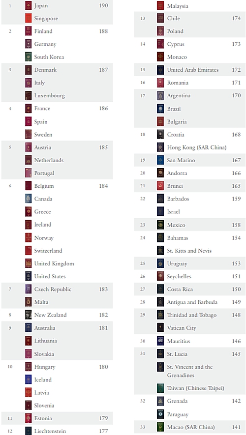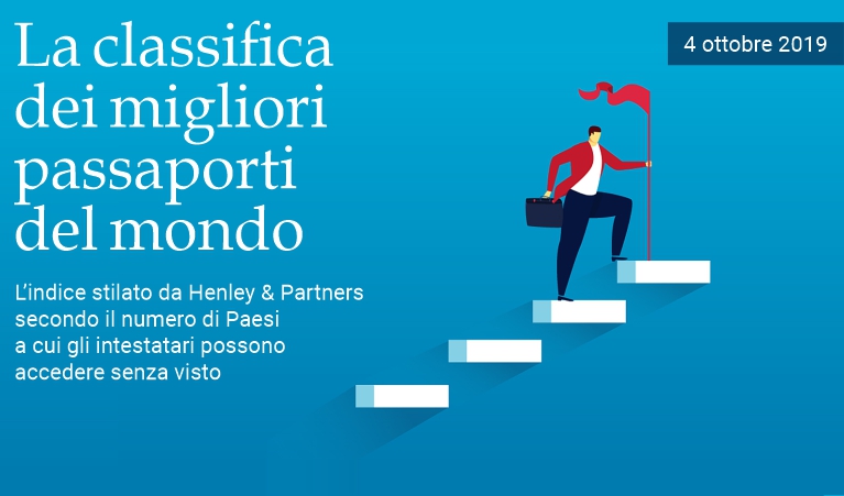4 ottobre 2019 - L'indice Henley Passport è la classifica dei passaporti del mondo per numero di destinazioni a cui gli intestatari possono accedere senza bisogno di un visto. La graduatoria si basa su informazioni fornite dall'International Air Transport Association (IATA), che mantiene la base dati più grande e accurata di informazioni sui viaggi, ed è arricchita dai costanti approfondimenti del dipartimento di ricerca di Henley & Partners. L'Italia è terza in classifica, insieme a Danimarca e Lussemburgo. I cittadini dello Stivale hanno accesso a 187 Paesi del pianeta senza vidimazione. Il Messico occupa il 23° posto e i titolari del suo passaporto hanno la possibilità di visitare 158 nazioni senza visto. È il quinto Paese latinoamericano presente nei primi 25 posti al di sotto di Cile, Brasile e Argentina e in posizione migliore rispetto all'Uruguay. Primi assoluti nel ranking sono i passaporti del Giappone e di Singapore, i cui titolari possono accedere a 190 nazioni senza sottoporsi a controlli amministrativi. Il passaporto con più restrizioni a livello mondiale è quello dell'Afghanistan, al 107º posto. I suoi cittadini possono accedere solo a 25 Paesi senza visto.