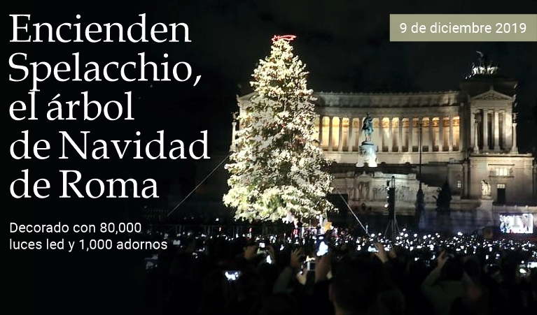9 de diciembre de 2019 - Decorado con 80,000 luces led y 1,000 adornos, entre esferas y copos de nieve, fue encendido esta noche el árbol de Navidad de Roma, apodado irónicamente Spelacchio (pelón) en 2017. Fue inaugurado por la alcaldesa Virginia Raggi quien en el acto estrenó también la iluminación de la adyacente Via del Corso, una de las más conocidas avenidas comerciales de la capital italiana. Los estudiantes de la escuela de canto coral del Teatro de la Ópera acompañaron el “regreso” del abeto más famoso de la ciudad eterna, que este año fue decorado con esferas principalmente rojas y doradas. «Por fin» —dijo Raggi entre los aplausos de la multitud— «estamos aquí para iluminar a Spelacchio, el árbol más famoso del mundo. Permanecerá encendido las 24 horas del día hasta el 6 de enero». (massimo barzizza / puntodincontro.mx)