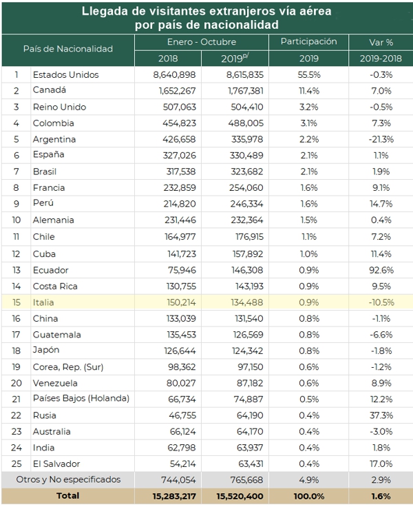 16 de diciembre de 2019 - A pesar de que durante el periodo enero-octubre de 2019 las llegadas vía aérea de visitantes extranjeros a México se incrementaron en 1.6% alcanzado los 15,520,400 individuos, los viajeros de nacionalidad italiana y argentina disminuyeron sensiblemente. Según datos de las secretarías de Turismo y Gobernación, los arribos de ciudadanos del Bel Paese cayeron en un 10,5% en comparación con el mismo período de 2018, mientras que la variación para la nación sudamericana fue de -21.3%. A fines del décimo mes de 2019, habían entrado a México 134,488 visitantes italianos, cifra que indica una clara tendencia a la baja por segundo año consecutivo. Los países que más aumentaron sus visitas fueron Ecuador (+92.6%), Rusia (+37.3%), El Salvador (+17%) y Perú (+14.7%).