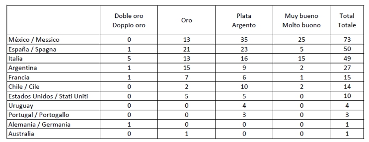 3 de septiembre de 2020 (4:31 hrs.) - El Conocedor —revista bimestral mexicana especializada en vinos, destilados y gastronomía— publicó los resultados de la edición 2020 del concurso Global Wine, que busca promover el consumo de vino en este país latinoamericano. En la máxima categoría, la doble oro, Italia obtuvo 5 de las 9 preseas otorgadas tras la realización de una cata a ciegas por expertos, sommeliers y enólogos altamente calificados y de prestigio internacional. En el cómputo total, el Bel Paese se clasificó 3º, después de México y España. Presentamos a continuación un resumen de los reconocimientos y el detalle de la tabla Doble oro