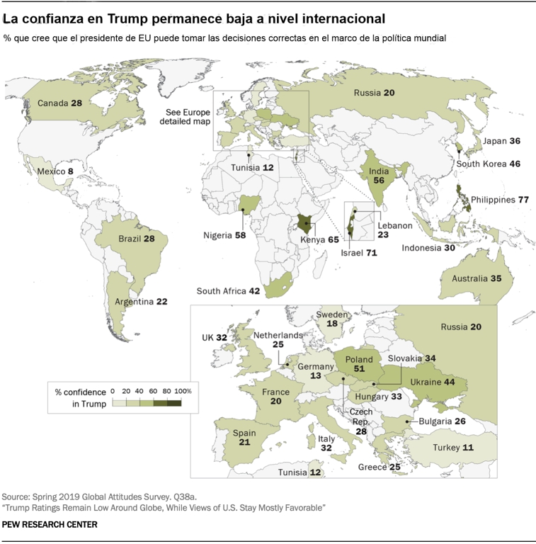 En casi todos los países donde hay datos de tendencias disponibles, Trump recibe calificaciones más bajas que su predecesor, Barack Obama. Como informó PRC en 2017, la confianza internacional en el Presidente de los Estados Unidos se desplomó desde su toma de posesión, lo que también ha provocado una caída en las evaluaciones favorables a los Estados Unidos como país. Para este reporte —que también cubre otros aspectos de la percepción de Trump— PRC utilizó datos de una encuesta realizada en 33 países entre el 18 de mayo y el 2 de octubre de 2019 con un total de 36,923 encuestados. (massimo barzizza / puntodincontro.mx)
