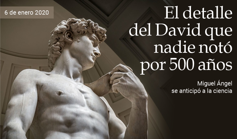 6 de enero de 2019 - Hay un detalle en el David de Miguel Ángel que pasó inadvertido durante 500 años de observación y que confirma el genio del gran escultor, pintor, arquitecto y poeta italiano, en grado con su “ojo clínico” de anticipar a la ciencia. Si bien en muchas esculturas, y en la fisiología cotidiana de las personas, la vena yugular en la parte superior del torso a través del cuello no es visible, en la obra maestra del Renacimiento expuesto en Florencia, está claramente “extendida” y en relieve sobre la clavícula de David. Como sucedería en cualquier joven saludable que se halla en un nivel de excitación al tener que enfrentar un adversario potencialmente letal. En este caso, Goliat.